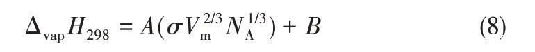 2006年,Kabo等[40]总结了摩尔体积、表面张力和摩尔汽化焓的关系,得出汽化焓的相关方程