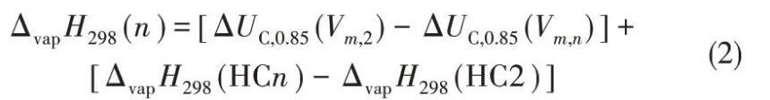 式中,ΔUC,0.85(Vm,n)是摩尔体积为Vm,n时的库仑能;Vm(HCn)和ΔvapH298(HCn)分别为直链烃CnH2n+2的摩尔体积和汽化热;Vm,n为[Cnmim][Tf2N]的摩尔体积。