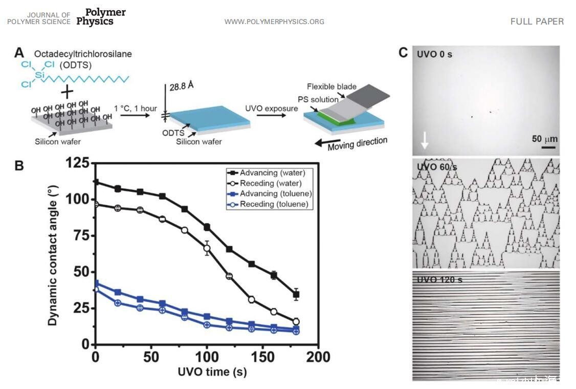 图 1 (A) 制备具有可调表面能的基材然后应用流涂工艺的示意图。 (B) 动态 接触角包括作为 UVO 时间函数的基材的前进(实心数据点)和后退(开放数据点)。 使用水(黑色数据点)和甲苯(蓝色数据点)的液体。 误差棒表示三个的标准偏差 独立样本。 (C) 在具有可调表面能的基材上制造的结构,从无沉积、超支化结构到通过流涂的水平线。 此处使用的其他流涂参数是初始浓度 co,如 0.5 mg/mL,停止时间 t 为 100 ms,设置距离 d 为 5 lm。