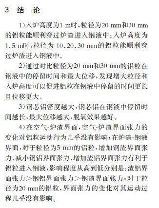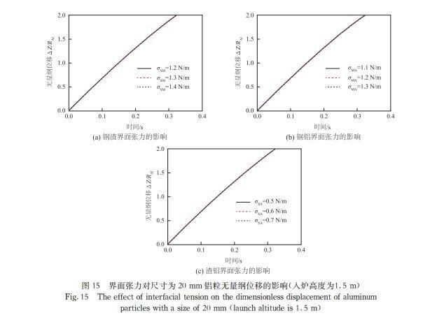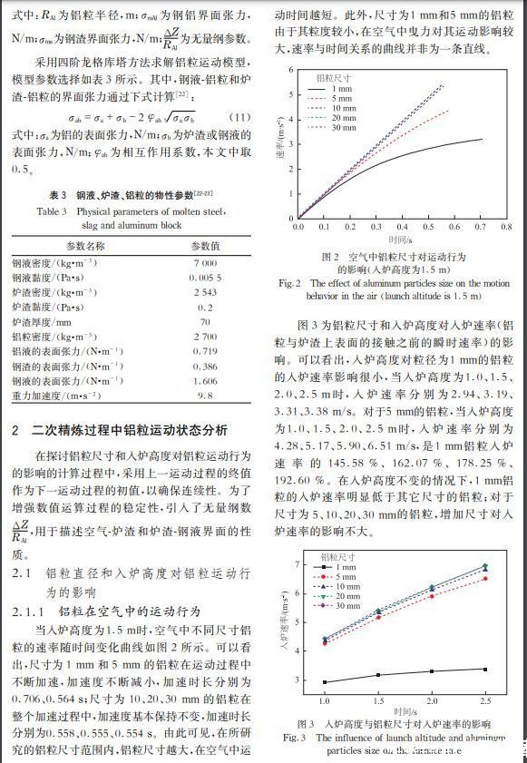 增加钢渣界面张力、减小钢铝界面张力或增加渣铝界面张力有利于铝粒进入钢液,而铝粒的尺寸大于20 mm,界面张力对铝块运动几乎没有影响;增大密度会使钢芯铝在钢液中停留更长时间,有利于钢液脱氧。