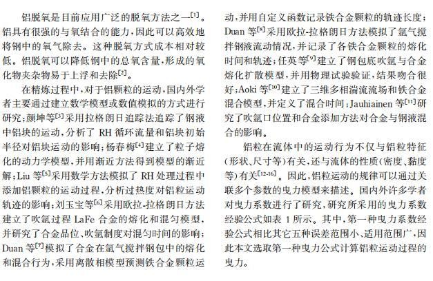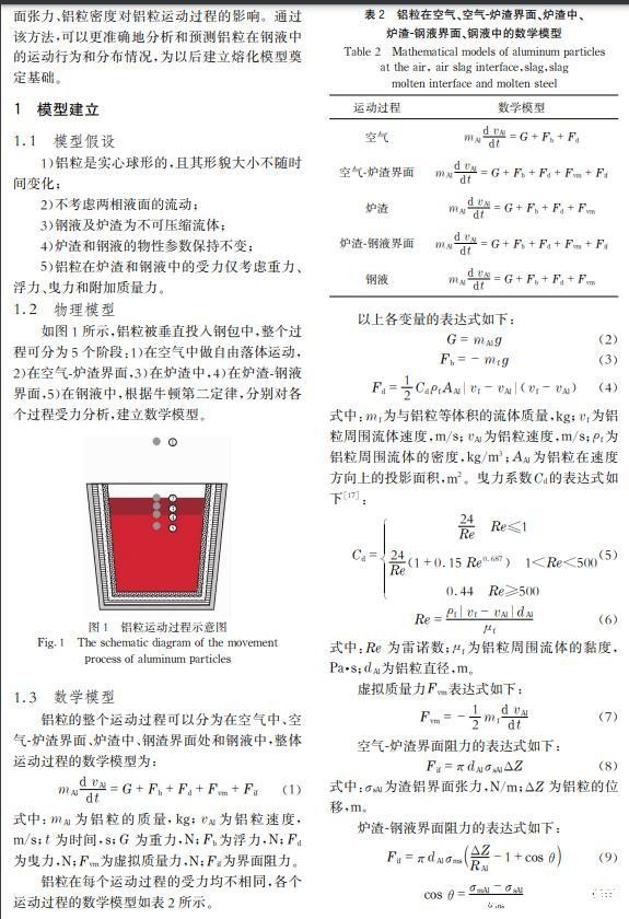 摘要: 二次精炼过程中,铝是钢液进行脱氧及合金化的主要物料之一,但纯铝的密度小于钢液,能否穿越渣层与钢液接触及接触时间对铝的脱氧效果和钢中溶解铝的含量有直接影响。在忽略铝的熔化、溶解及化学反应的情况下,通过对铝粒运动过程受力分析,建立铝粒在气-渣-钢相内的三维运动数学模型,明晰铝粒尺寸及入炉高度对铝粒运动轨迹的影响。