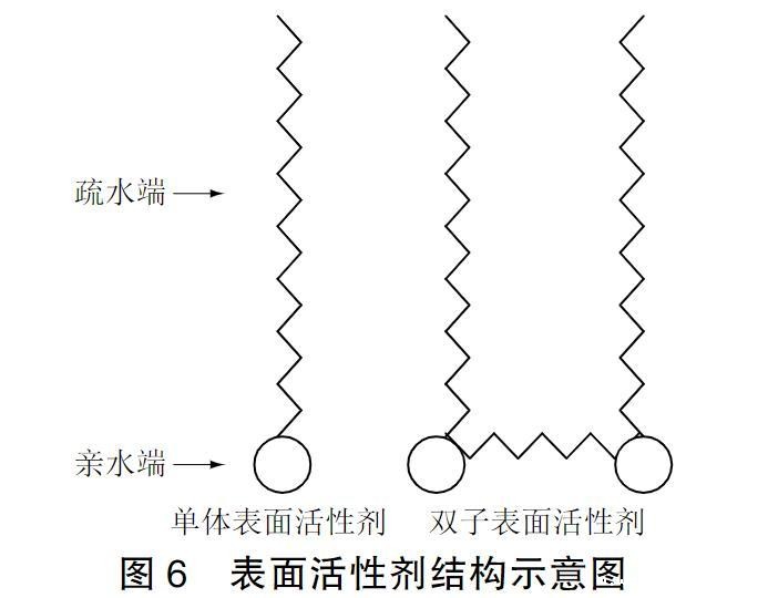 从浆液固化反应机理分析:在CW灌浆材料配方中除环氧树脂外,还含有糠醛、丙酮等成分。体系中存在3种化学反应,既有环氧基团与固化剂的逐步聚合反应,也有糠醛、丙酮之间а氢的反应,还有糠醛、丙酮与固化剂中胺的反应。随着反应时间的延长,体系分子量不断增加,从而导致浆液的表面张力和接触角均随时间的延长而不断增加。从图3中可以看出加入表面活性剂S1、S2能降低浆液的表面张力和接触角。这是因为本次浆液改性选用的表面活性剂S1、S2从化学结构上属于双子型非离子表面活性剂。传统表面活性剂和双子型表面活性剂结构示意图如图6所示。亲水端疏水端单体表面活性剂双子表面活性剂。