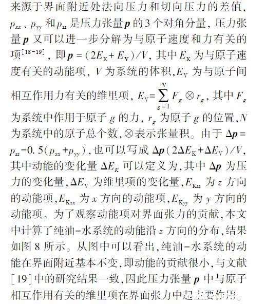 在界面张力的模拟计算公式(5)中,界面张力来源于界面附近处法向压力和切向压力的差值,pxx、pyy和pzz是压力张量p的3个对角分量,压力张量p又可以进一步分解为与原子速度和力有关的项,即p=(2EK+EV)/V,其中EK为与原子速度有关的动能项,V为系统的体积,EV为与原子间相互作用力有关的维里项,EV=∑Ng=1Fg⊗rg,其中Fg为系统中作用于原子g的力,rg为原子g的位置,N为系统中的原子总个数,⊗表示张量积。由于Δp=pzz-0.5(pxx+pyy),也可以写成Δp(2ΔEK+ΔEV)/V,其中动能的变化量ΔEK可以定义为,其中Δp为压力的变化量,ΔEV为维里项的变化量,EKzz为z方向的动能项,EKxx为x方向的动能项,EKyy为y方向的动能项。为了观察动能项对界面张力的贡献,本文中计算了纯油-水系统的动能沿z方向的分布,结果如图8所示。从图中可以看出,纯油-水系统的动能在界面附近基本不变,即动能的贡献很小,与文献中的研究结果一致,因此压力张量p中与原子相互作用有关的维里项在界面张力中起主要作用。因为压力张量中的动能项对压力影响很小。
