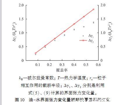 图9不同覆盖率ϕ时颗粒-颗粒的二维径向分布函数为了研究界面颗粒覆盖率对界面张力的影响,建立了底面边长为30rc、高度为40rc的正方体模拟区域来容纳更多的颗粒,分别将不同数量的颗粒随机放置于界面上,并采用2种方法计算不同颗粒覆盖率下的界面张力。
