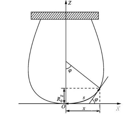 悬滴法利用测定处于重力与表面张力平衡状态的液滴外形,获得待测液体的表面张力。悬滴外形的几何关系如图1所示,在考虑液体静压作用的基础上,由经典Young-Laplace方程推导得归一化Bashforth-Adams工作方程为,式中:σ为表面张力;φ表示外形轮廓线某点切线与横坐标夹角;s为弧长;R0为顶点曲率半径;ρl、ρg分别表示液相和气相密度;g代表当地重力加速度,本文取为9.7965 m·s-2。