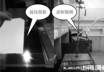 图4产生波纹投影的水槽(左)和录制视频的手机(右)