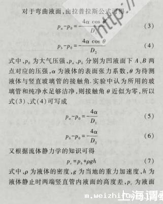 根据式(8),只需测量两竖直管的直径D1、D2以及管中凹液面的高低差h,便可以计算出待测液体的表面张力系数。