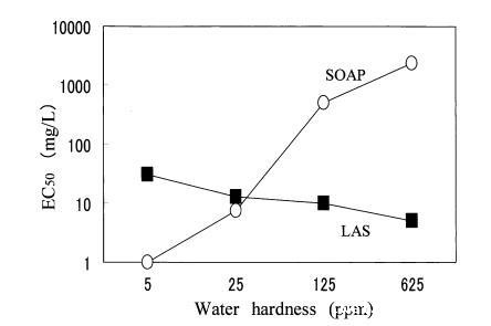 在预测试中,大型水蚤在 4 盐混合中存活 溶液,但不能在 CaCl2・H2O 溶液中存活,也不能 蒸馏水。 另一方面,罗汉松在所有 3 种水中都能存活。 因此,罗汉果被用来 检查水硬度成分对 LAS 和 SOAP 的毒性。 如图 3 所示,CaCl2・H2O 之间没有观察到毒性值的差异 溶液和四盐混合溶液。 肥皂的毒性 随着水硬度的增加而降低,和 LAS的毒性随着水硬度的增加而增加。