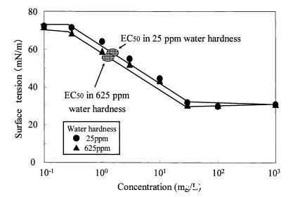 图 9 水硬度对表面张力的影响 烷基硫酸盐和有毒表面张力曲线 Daphnia Magna 的价值。