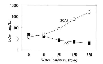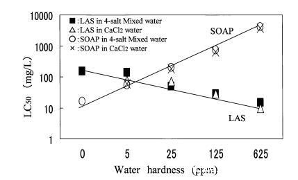 图 4 水硬度对急性毒性的影响 LAS 和 SOAP 到 4-盐混合中的 Orysis Latipes 水。