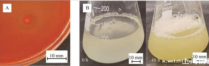图2菌株O5的刚果红染色(A)及降解瓜尔胶特性(B)