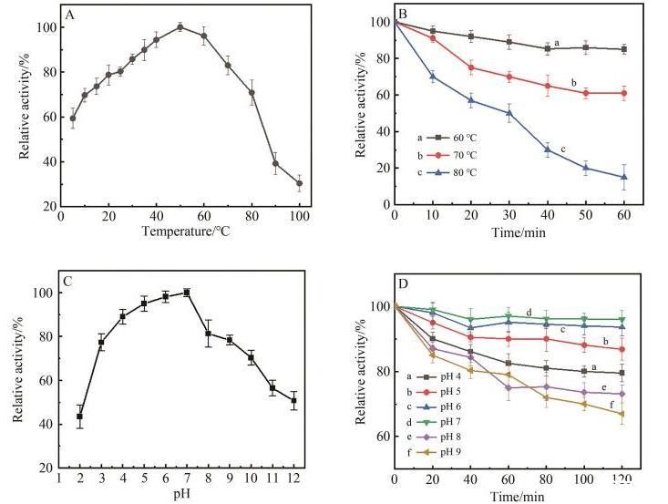 图5C是不同pH值条件下ME-O5的相对活性,结果表明,ME-O5的最适pH=7.0。当pH值在2.0~7.0时,随着pH值增大,ME-O5的相对酶活力增加,在pH=2.0时仍能保持43%的相对酶活力;当pH值在7.0~12.0时,随着pH值的继续增大,ME-O5的相对酶活力逐渐降低。但pH值在3.0~9.0范围内,ME-O5均能够维持70%以上的酶活力,具有一定的pH值适应性和较宽的pH值耐受范围。