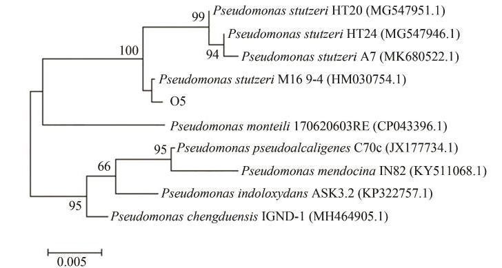 利用16S rRNA基因测序对菌株O5进行鉴定,将测序结果通过NCBI数据库中的BLAST进行比对分析,发现菌株O5与假单胞菌的同源性最高,为99.87%。利用MEGA软件构建系统发育树(图4)。由图4可知,菌株O5和施氏假单胞菌Pseudomonas stutzeri M16-9-4位于进化树的同一分支中,亲缘关系最相近。综合形态特征鉴定,鉴定菌株O5为施氏假单胞菌(Pseudomonas stutzeri),命名为Pseudomonas stutzeri O5。