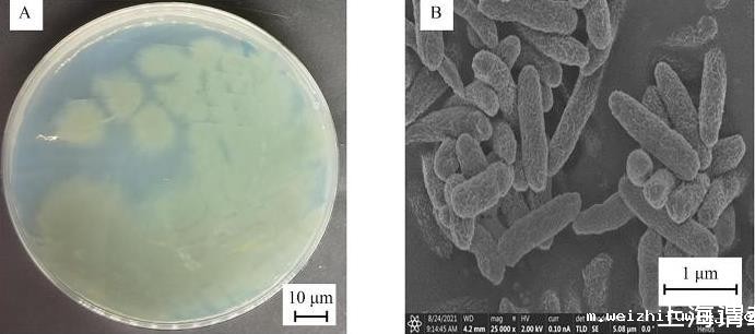 形态学鉴定如图3所示,菌株O5在LB平板上呈灰绿色,表面光滑隆起,边缘不整齐;革兰氏染色鉴定为阴性;经扫描电子显微镜观察得,菌株O5为杆状菌,菌体长为1.5~2.0μm,宽为0.3~0.4μm。
