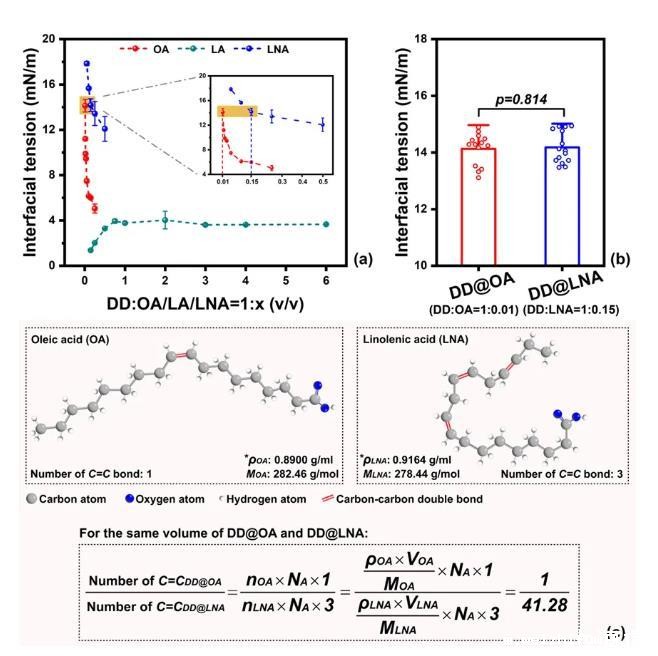 图1.模型油脂的筛选:(a)油酸/亚油酸/亚麻酸与十二烷不同体积比例复配后的油-水界面张力;(b)最终筛选得到的两种模型油相的界面张力(DD OA和DD LNA);(c)相同体积下,DD OA与DD LNA分子内的碳-碳双键比例