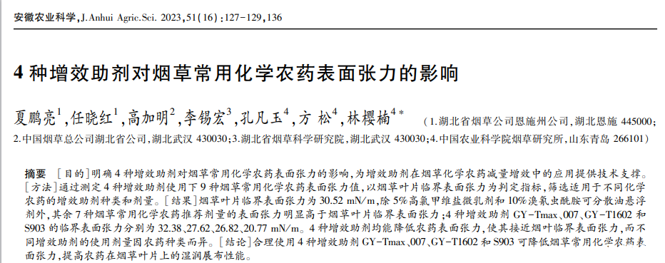 [方法]通过测定4种增效助剂使用下9种烟草常用化学农药表面张力值,以烟草叶片临界表面张力为判定指标,筛选适用于不同化学农药的增效助剂种类和剂量。