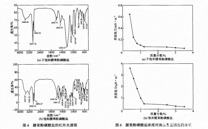 (1)采用生物质腰果酚和饱和腰果酚为原料,通过磺化和中和两步反应合成了两种具有两亲性质的腰果酚磺酸盐。红外光谱表征结果表明,所合成的化合物与理论结构基本相符。
