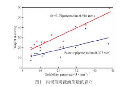 对于纯物质的溶解度参数可通过文献查阅、基团贡献计算法和液体热力学关系式计算。而矿物油为混合物,很难查到或者估算它的溶解度参数。文献提供了一种溶解度参数的估算法:称量10~20滴液体,然后计算每滴液体的平均质量;另取2种已知溶解度参数的非挥发性液体作为参照,通过做图大致计算出液体的溶解度参数。实验需保持恒温。分别通过内径为0.916 mm的10 mL移液管和内径为0.705 mm的巴斯德移液管移取液滴,得到两条溶解度参数与液滴质量的关系曲线。内聚能对液滴质量的影响见图1。由图1可见,液滴的质量与液体溶解度参数成线性关系。该估算方法可用来计算混合液体的溶解度参数,适用于矿物润滑油溶解度参数的计算。虽然估算方法过于粗糙,但为估算矿物油等复杂混合物的溶解度参数提供了思路。文献介绍了液滴的大小与液体表面张力有关。由此可见,溶解度参数与表面张力存在一定的关系。