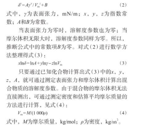 只要通过已知化合物计算出式(3)中的x,y,z,A,就可通过测定表面张力和摩尔体积计算出混合物质的溶解度参数。由于混合物的摩尔体积无法直接测出,可通过测定密度和估算平均摩尔质量的方法进行计算,见式(4):