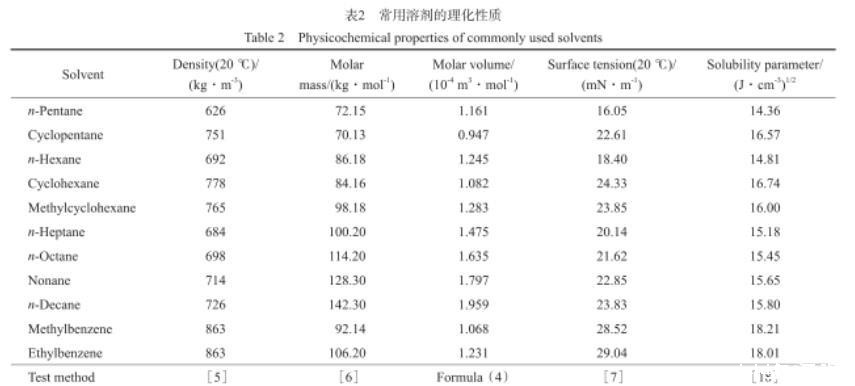 溶解度参数是表示物质结构特点的参数,但只适用于非极性液体混合物。Hansen认为液体的内聚能为色散力、极性力和氢键3种分子间作用力的贡献之和,从而将溶解度参数推广到极性系统和缔合系统之中,建立了三维溶解度参数体系。浅色矿物油属于非极性液体混合物,完全适用于公式(1)。