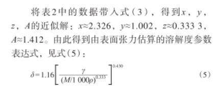 将表2中的数据带入式(3),得到x,y,z,A的近似解:x≈2.326,y≈1.002,z≈0.333 3,A≈1.412。由此得到由表面张力估算的溶解度参数表达式,见式(5):