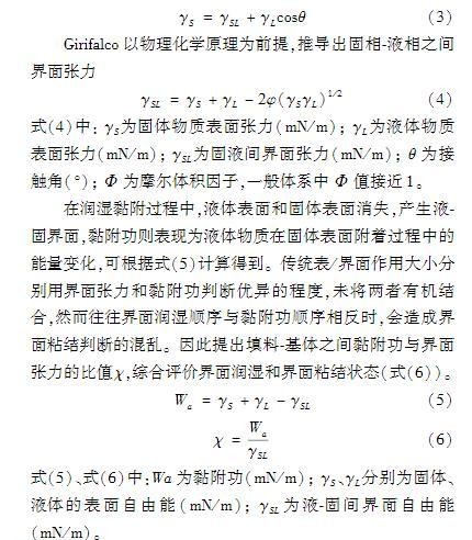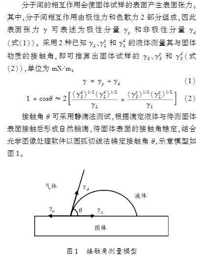 接触角法属于热力学方法,以浸润理论为基础,当液体与固体填料表面接触时达到浸润平衡。YoungT以一种液体附着在另一种固体上作用力平衡为前提条件,提出了著名的杨氏方程