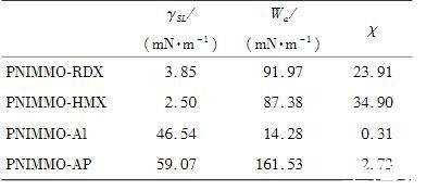 黏附功的大小决定界面上粘结作用的强弱,将表1、表2中数据代入式(5)中,可计算得到PNIMMO与RDX、HMX、Al及AP之间的黏附功值Wa.如表3所示,PNIMMO与4种推进剂组分之间的黏附功大小顺序为:Wa(PNIMMO——AP)>Wa(PNIMMO——RDX)>Wa(PNIMMO——HMX)>Wa(PNIMMO——Al)。由此可知,PNIMMO与AP在界面上的粘结作用最牢固,与Al的粘结作用最弱,说明当Al存在于PNIMMO推进剂体系中时,受力最易发生脱离。