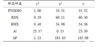 将表1中的接触角测试结果代入式(2)中,利用Owens——Wendt——RabelandKaelble(OWRK)拟合得到PNIMMO及推进剂组分的表面张力,如表2所示。5种样品的表面张力大小顺序为:γ(AP)>γ(RDX)>γ(HMX)>γ(PNIMMO)>γ(Al),其中PNIMMO、RDX、HMX和AP中表面张力的极性分量γp均远大于色散分量γd,说明其表面张力中极性分量贡献更多;而相反Al粉表面张力中色散分量对其表面张力作主要贡献。一般而言,当粘合剂的表面张力小于推进剂中单质固体组分的表面张力时,粘合剂才能较好地包覆于推进剂表面。PNIMMO的表面张力为35.52mN/m,明显小于RDX、HMX及AP的表面张力,说明PNIMMO比较容易铺展于其他固体物质表面。即PNIMMO对RDX、HMX和AP3种固体组分的包覆效果良好。