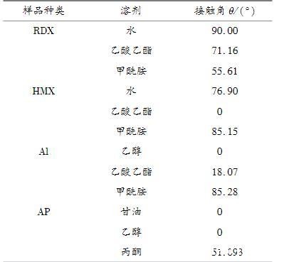实验试剂:PNIMMO(工业级【Mn(相对分子质量)=4747],西安近代化学研究所);HMX(60——70μm)、RDX(30——50μm)工业品,甘肃银光化工集团有限公司;高氯酸铵(AP,粒度20——30μm)、Al(粒度40μm)、甘油、乙二醇、乙醇、乙酸乙酯、甲酰胺、丙酮,工业级,市售;去离子水,自制。实验仪器:OCA200接触角测量仪,德国Dataphysics公司;YP——15手动粉末压片机,天津中世沃克科技发展有限公司;AHX——871安全烘箱,南京理工大学机电厂。