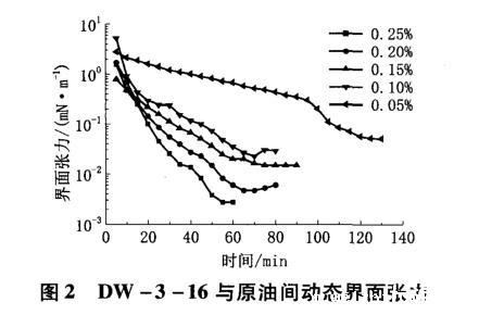 从图2看出,DW-3-16含量为0.20%~0.25%时,DW-3-16使得油水界面张力达超低界面张力(10-3mN/m);随着含量增加,其界面张力逐渐降低,且在50 min内达到平衡。
