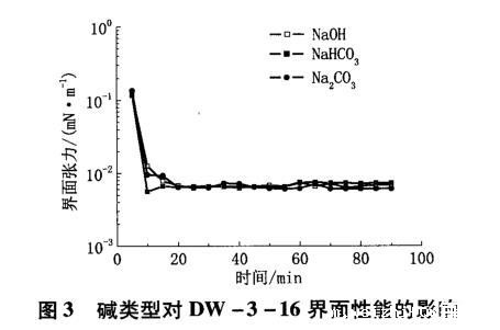 三元复合驱中注入碱能引起地层黏土分散、运移,导致地层渗透率下降,碱与油层流体及岩石矿物反应,可形成碱垢,对地层造成伤害,会引起油井结垢,影响油井正常生产;加入碱能大幅降低聚合物的黏弹性。因此,碱对DW-3-16表面活性剂性能的影响至关重要。