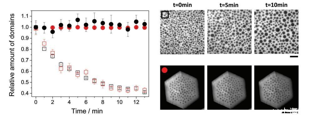 图 5 带电(圆形)和中性(方形)双层(红色)或单层(黑色)的域相对数量与时间的关系。 这些图像是一个例子 中性单层(上)和带电(下)双层在指定时间。 图像中包含的符号对应于图像中的相同符号 形象的。 比例尺对应于 50 毫米。
