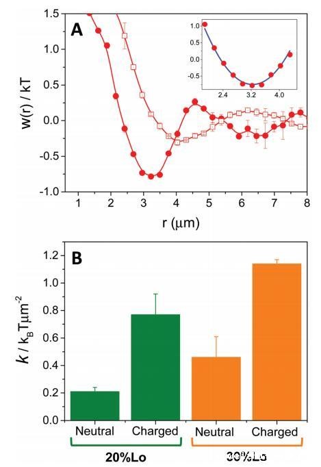 图 4 (A) 域之间的平均力势 w(r) 从 由带电(圆圈)或 中性(正方形)域。 插图:拟合实验的例子 数据(蓝色曲线)对应于 20%Lo 的带电域。 (B) 春天 谐波电位常数,通过拟合 w(r) 的第一个谷值获得 为中性和带电双层的二次函数(见 A 中的插图) 以指定的液体顺序百分比。