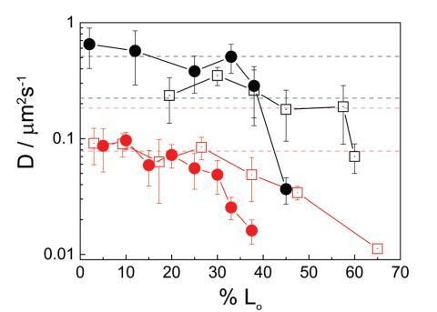 图 2 扩散系数(D)的实验值 小域 (1–3 mm) 作为面积百分比的函数 由液体有序相。 正方形代表中性系统和 环绕带电系统。 黑色符号对应 气水界面处的单层和双层的红色符号。 虚线对应于计算的 Dt 值的范围 域大小的范围,使用方程 (2) 或 (3)。 实线只是画的 引导眼睛。