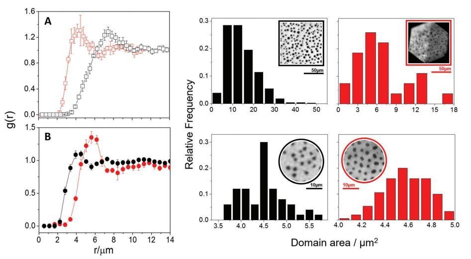 图 3 中性 (A) 和带电 (B) 域的径向分布函数及其各自的域区域分布。 双层显示为红色 和黑色的单层。 (A) 中的 %Lo 对应于 20–23%,而 (B) 中的 %Lo 对应于单层和双层的 16–19%。 插图:代表性荧光 脂质膜的图像。