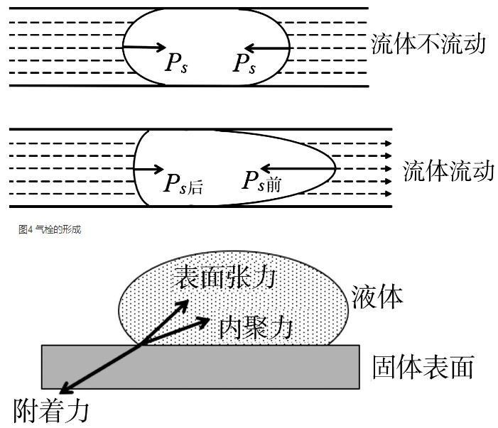 液体流动时会受到液体中气泡的阻碍作用。若流管较细且液体中气泡较多时可能会因为气体阻碍作用严重而造成流管堵塞,这种现象称气体栓塞,简称气栓。