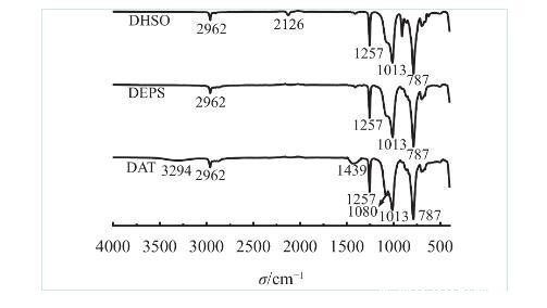 由图1可知,在DHSO的红外光谱中,2126 cm−1处为Si—H的伸缩振动吸收峰,1013 cm−1处为Si—O—Si伸缩振动峰,1257 cm−1、787 cm−1处为—Si(CH3)2—的特征振动峰,2962 cm−1处为—CH3和—CH2中C—H键的伸缩振动峰;与DHSO的红外光谱相比,DEPS的红外光谱中,2126 cm−1处Si—H的伸缩振动吸收峰消失,表明硅氢加成反应成功进行;与DEPS相比,DAT的红外光谱中,3294 cm−1处出现—OH的伸缩振动吸收峰,—OH是环氧基开环产生的,1080 cm−1为C—N的伸缩振动吸收峰,1439 cm−1为—N(CH3)3的特征峰,表明DEPS中的环氧基成功开环与TMHC发生加成反应。