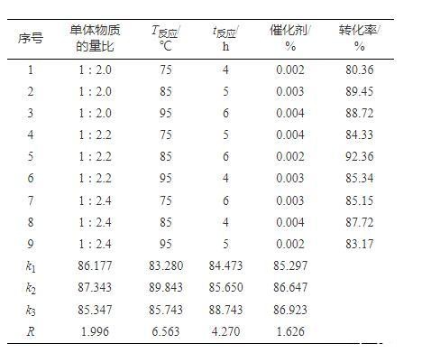 异丙醇占单体总质量的30%,设计正交实验来确定中间体双端环氧基改性聚硅氧烷(DEPS)合成的最佳条件,四个影响因子分别为DHSO与AGE的物质的量比、反应温度、反应时间、催化剂加量(以铂记,对单体总质量),对每个因子设定3个水平。正交实验优化反应条件见表1。