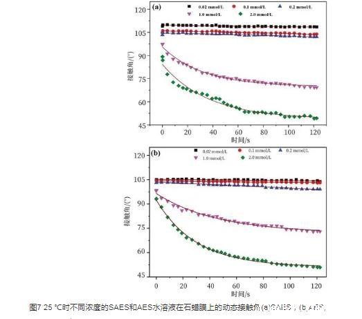 图7 25℃时不同浓度的SAES和AES水溶液在石蜡膜上的动态接触角(a)SAES;(b)AES。