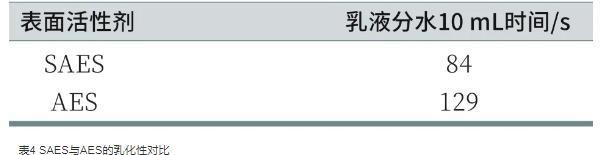 乳化作用是在一定的外力作用下使不混溶的两种液体形成具有一定稳定性的液液分散体系的作用,该分散体系被称为乳状液,是一种热力学不稳定体系。为了评估SAES和AES的乳化性,采用量筒法测定了二者对液体石蜡的乳化能力,记录从乳液中分离出10 mL水所需要的时间,时间越长,乳化性能越好。SAES与AES的乳化性对比如表4所示。从表中可以看出,SAES的乳化性低于AES,这可能是因为SAES分子中的支链结构,使得其分子总体积相对较大,在空间位阻以及电性斥力作用使疏水基难以插入油相中,即与液体石蜡之间的相互作用较弱,乳化性较差。