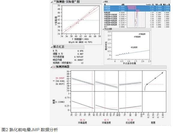 通过JMP分析软件对正交试验数据进行分析整理,如图2所示,建模分析R方为0.976,接近于1,说明正交因素与响应值的拟合度较高;交互作不显著;通过筛选对比各因素的个体p值,熟化环境温度的个体p值为8×10-4,熟化环境湿度的个体p值为9×10-4,反应程度的个体p值为0.014,电晕温度的个体p值为0.196 4,个体p值越小,因素的影响力最大。且从半正态图也可得出熟化环境温度为第一影响因素,熟化环境湿度为第二影响因素。因此,熟化前电晕环境温湿度及电晕影响因素从大到小依次为熟化温度、熟化湿度、反应程度;电晕温度影响较小,可忽略。