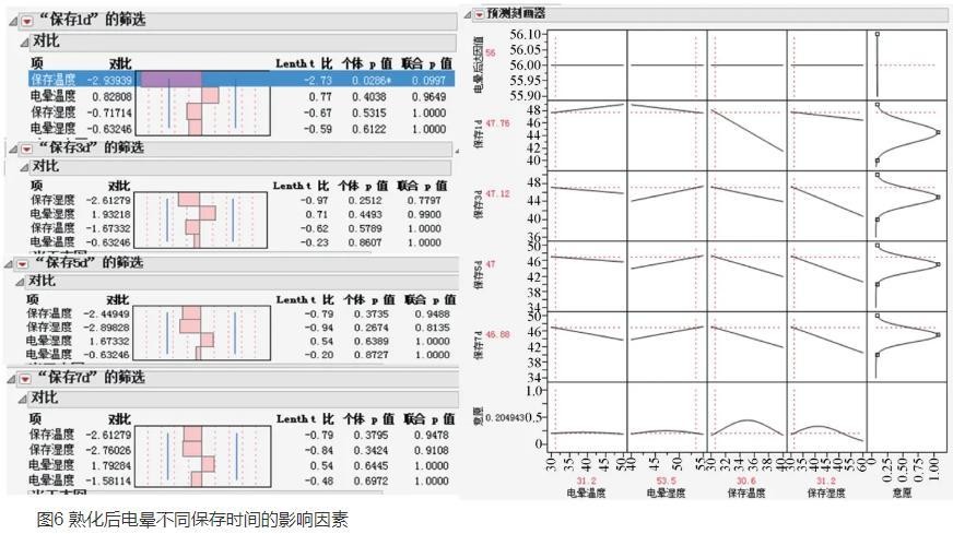 通过个体P值数据分析,保存温度的影响最大,保存1 d影响因素从大到小依次为保存温度、电晕温度、保存湿度、电晕湿度;电晕温度影响较小,可忽略。随着保存时间的延长,保存湿度的影响逐渐增大。电晕温度或湿度随着保存时间的延长影响逐渐减小。因此整天分析影响因素为保存温度>保存湿度>电晕湿度>电晕温度。