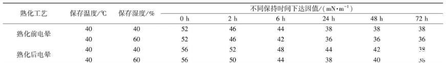 对比耐候层熟化前电晕、熟化后电晕在相同保存温度、保存湿度环境下耐候层达因值的变化规律,如表8所示。