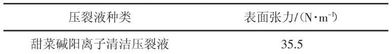 由表3可知,甜菜碱阳离子清洁压裂液的破胶液的表面张力比水的表面张力明显要低,为35.5 N/m。压裂液易于返排,对油气层的损害低。