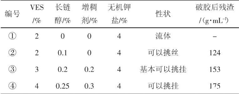 由表1可知④号配方当VES的含量为4%,长链醇为0.25%,无机钾盐含量为4%,增稠剂含量为0.3%时可以挑挂且残渣量少,为最佳的配比。甜菜碱型阳离子清洁压裂液的配方(见表2)。