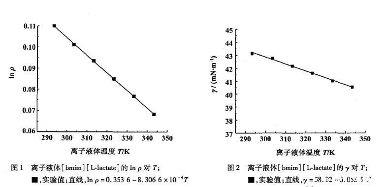 在293.15~343.15 K温度范围内实验测得的离子液体[bmim][L-lactate]的表面张力值随温度的升高而减小(图2),并且得到表面张力的经验方程: