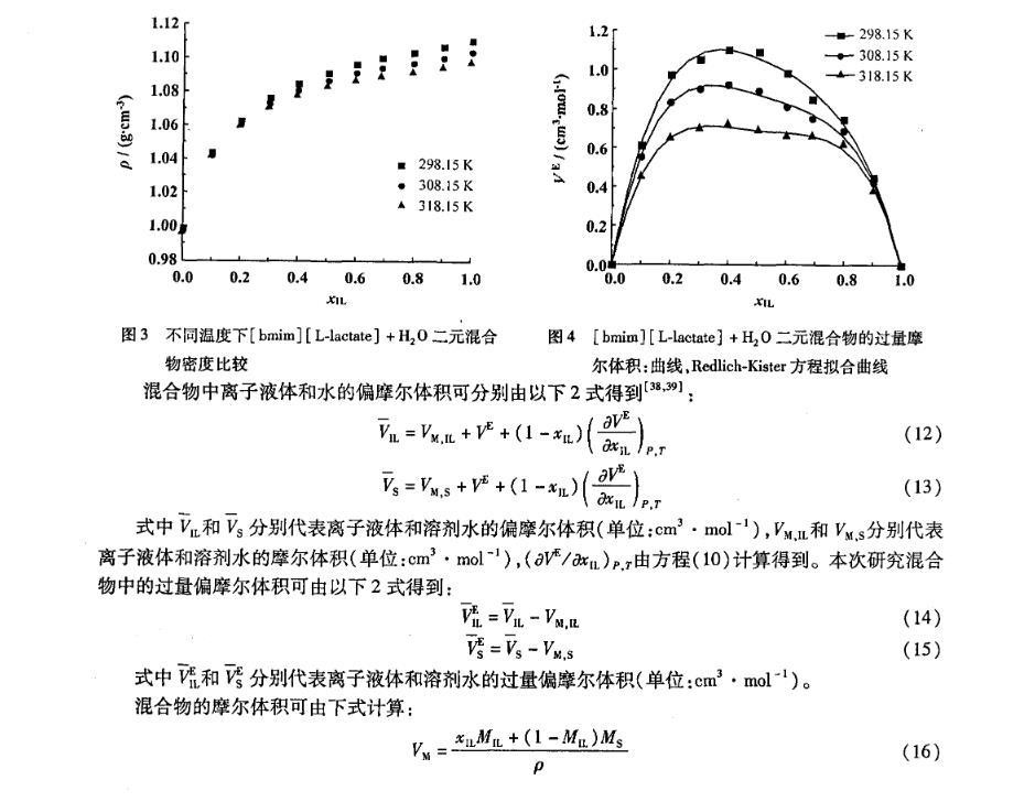 图5[bmim][L-lactate]+H2 O二元混合物中IL过量偏摩尔体积