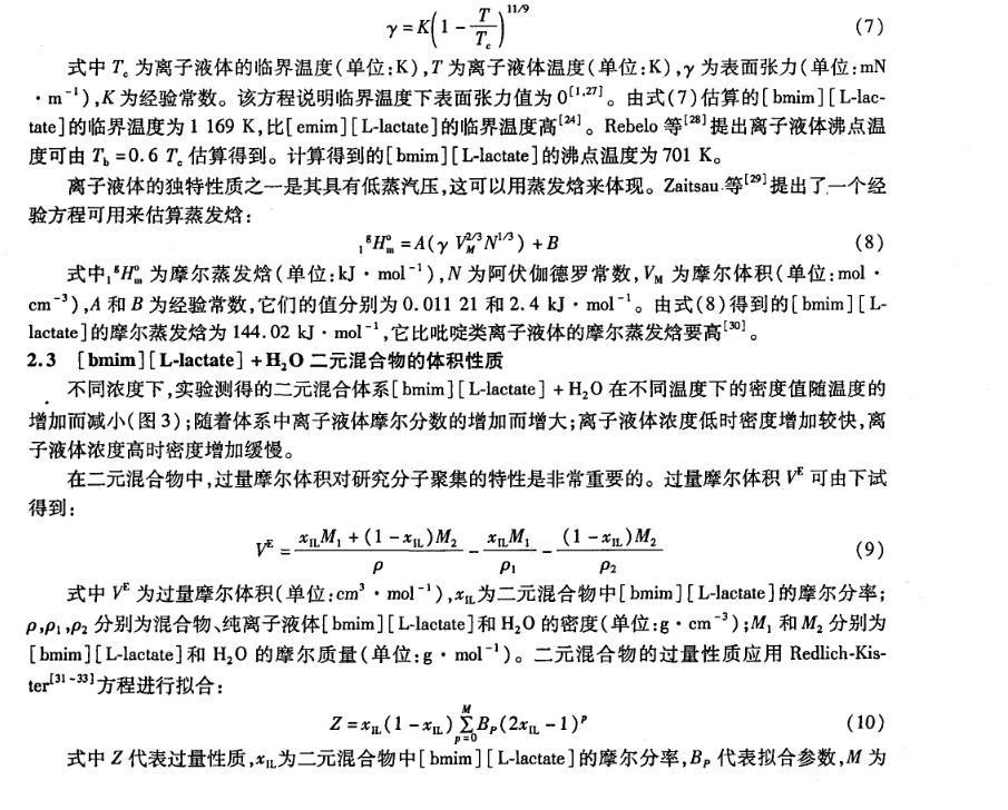 离子液体的临界温度(critical temperatures,Tc)是其重要的物理化学性质之一,然而离子液体本身的性质使得临界温度的实验值很难获得。因此,许多研究小组应用Guggenheim经验方程来推测离子液体的临界温度。该经验方程的形式为: