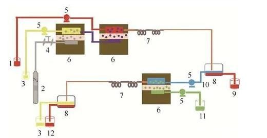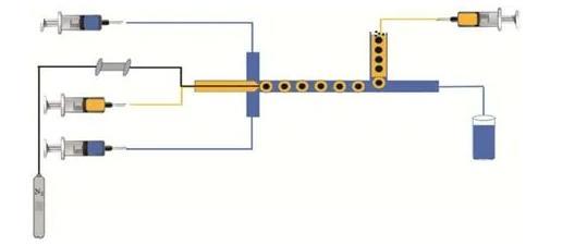 已有的研究结果表明微尺度气液液三相流具有独特的流动、传递及反应规律,在化学反应、材料制备、萃取分离等多个领域均有着重要的应用。在化学反应领域,Onal等曾以氢气作为气相,不饱和醛类为连续相,催化剂的水溶液为分散相,在该体系中系统研究了不饱和醛类选择性加氢的过程并揭示了反应动力学。在材料制备领域,Lee等曾以氮气作为内相,含有硅纳米颗粒的甲苯溶液作为中间相,连续相为2%PVA水溶液。在该体系中随着双乳液油相中甲苯溶剂的挥发,逐渐形成了硅纳米颗粒堆积壳层的中空微球。