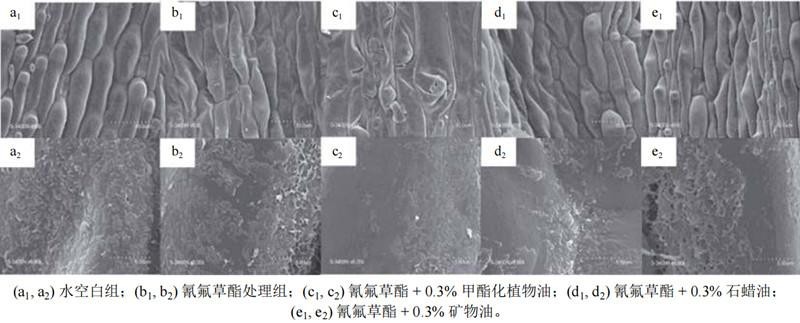 通过扫描电镜观察稗草叶片结构变化探究了油类助剂对氰氟草酯防除稗草的增效作用。作者分别对比了纯水、氰氟草酯处理和添加油类助剂的氰氟草酯处理后的稗草叶片结构,发现水对稗草叶表面的蜡质层和表皮细胞没有任何影响(图1a1,a2),氰氟草酯使表皮细胞略有萎缩(图1b1),溶解了少量的表皮蜡质层(图1b2),而添加油类助剂后均发生表皮细胞变窄萎缩和蜡质层溶解的现象(图1c1-e2)。其中,石蜡油和矿物油能使表皮细胞变窄变小,水分减少(图1d1,e1),溶解大约30%的表皮蜡质(图1d2,e2)。甲酯化植物油(MSO)能较大程度地使表皮细胞萎缩(图1c1),溶解超过50%的蜡质层(图1c2)。正是因为MSO(体积分数0.5%)溶解了大量稗草叶片的表皮蜡质层,严重破坏了叶片的角质层,从而极大地增强了稗草叶片对氰氟草酯的渗透和吸收能力,使其对氰氟草酯防除稗草的防效提高了78.7%。